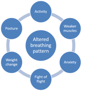 So why do we get breathless? Being breathless is normal for everyone- if we were to go and run around or do some other activity outside we would all get breathless from doing so. You may find that doing certain things now makes you more breathless than usual- if you have been unwell for a while and less able to do your usual activities you may have become deconditioned where your muscles are a bit weaker from not being as active, this in turn will mean that moving is more effortful and therefore make you more breathless. Feelings such as anxiety, stress, worry etc. can cause your body to go into the “fight or flight” response, where your body is getting ready to respond to a situation and therefore starts to breathe harder and shallower, leading to feelings of breathlessness. Being underweight or losing weight may mean your breathing muscles have become smaller and weaker, therefore taking more effort to get air in and out of your body. Being overweight or gaining weight can make activities more strenuous, and also put more pressure around your chest and diaphragm which can restrict how much your lungs can expand. Having a poor posture where shoulders are elevated or rounded, our upper body is in more of a hunched position or our head is more forward, can all make our breathing more effortful and therefore lead to breathlessness quicker. With all of these factors, the main thing to note is that they can lead to our body changing the way we breathe away from the ideal method, thus leading to an altered breathing pattern.